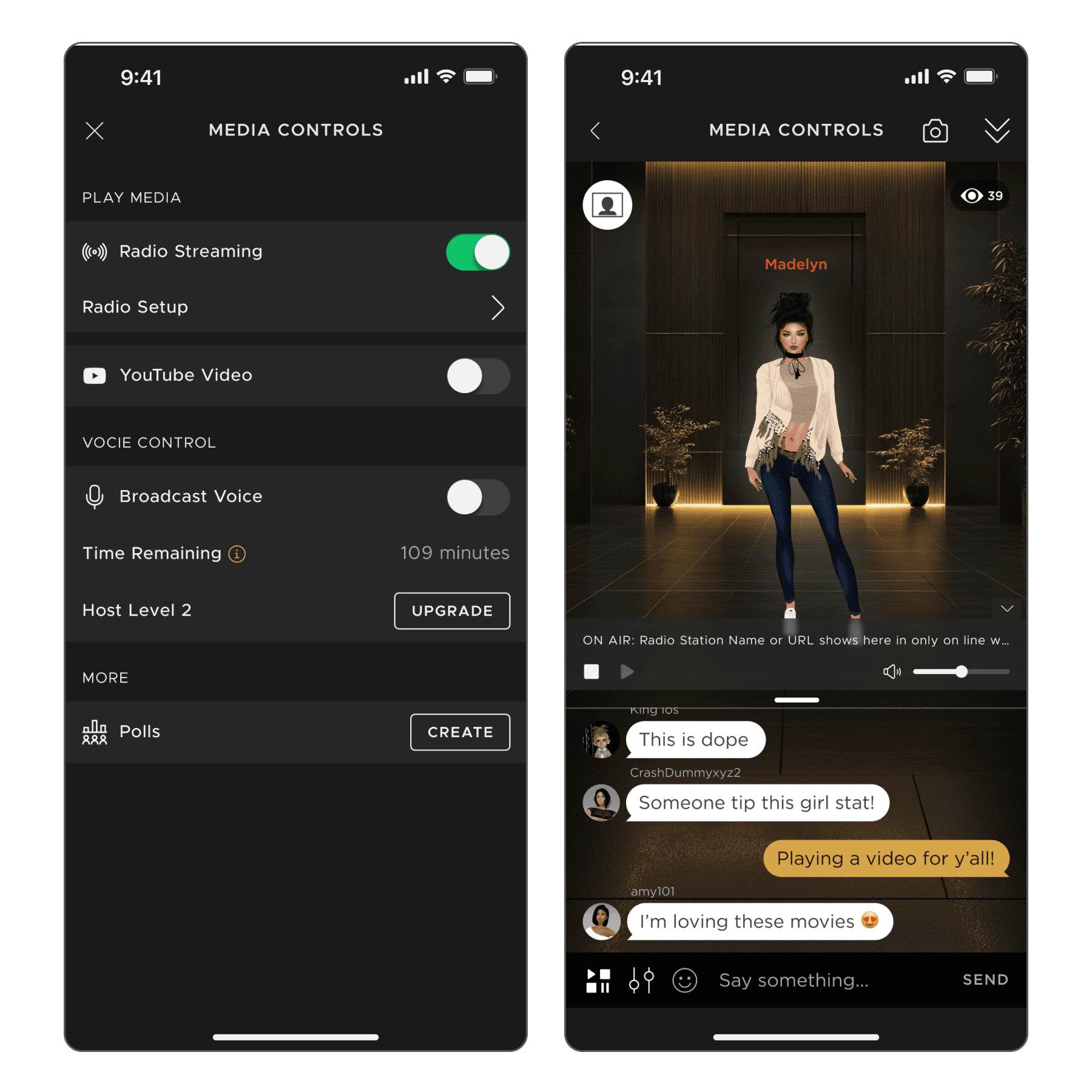 Radio Streaming became the third entertainment pillar in IMVU’s ecosystem — after Voice (presence) and Video (shared attention). This feature focused on shared atmosphere, encouraging passive participation and ambient engagement.
